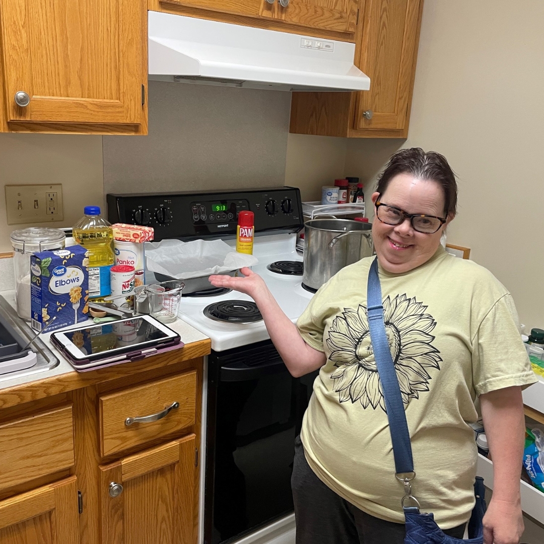• Cooking and Shopping: Staff help Trisha improve her cooking skills, learn new recipes, and go shopping. Trisha does a great job prepping for these services, getting out ingredients and utensils, and creating her own shopping lists.